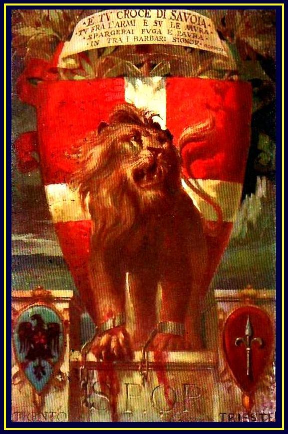 | " L'immagine scelta come copertina di questa pubblicazione mostra un Leone che con determinazione, coraggio e forza si libera dalle catene restituendo all'ITALIA le due città Trento e Trieste dette sorelle assunte come simbolo per la definitiva riunificazione di tutto il Popolo Italiano " ( c.convertino ) |